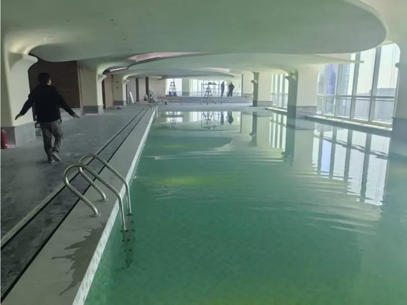 Системот за базен на висока надморска височина на хотелот е подобрен со примена наБлувејТехнологија на топлинска пумпа за базен. Дизајниран за енергетска ефикасност и прецизна контрола на температурата, системот на Blueway гарантира дека водата во базенот останува на удобна и конзистентна температура во текот на сите сезони.
